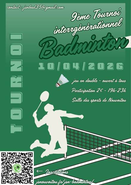Le JSN badminton organise son 9 ème tournoi intergénérationnel le vendredi 10 avril de 19h à 23h à la salle des sports Henri Verger de Nouvoitou. Ouvert à tous les Nouvoitouciens et Nouvoitouciennes, jeunes, adultes, parents, hommes, femmes, licenciés 2025-2026, mais aussi aux anciens du club et aux amateurs du dimanche.